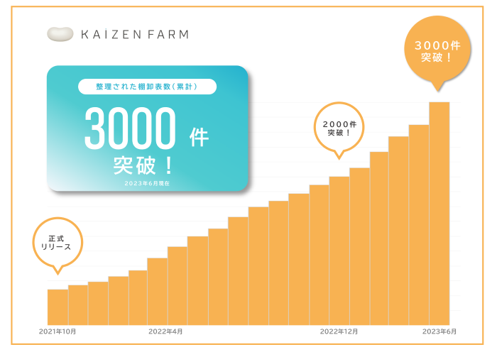 2023.06.132021年10月の正式リリースから1年8か月経過し、遂にKAIZEN FARMを使用した棚卸数が累計3000件を突破しました。