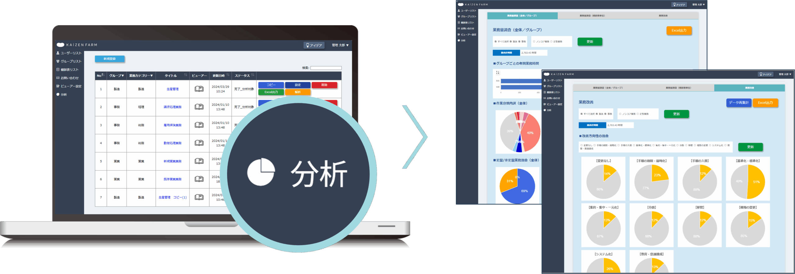 業務量調査や業務改善の方針を決める上で必要な分析機能を搭載しています。